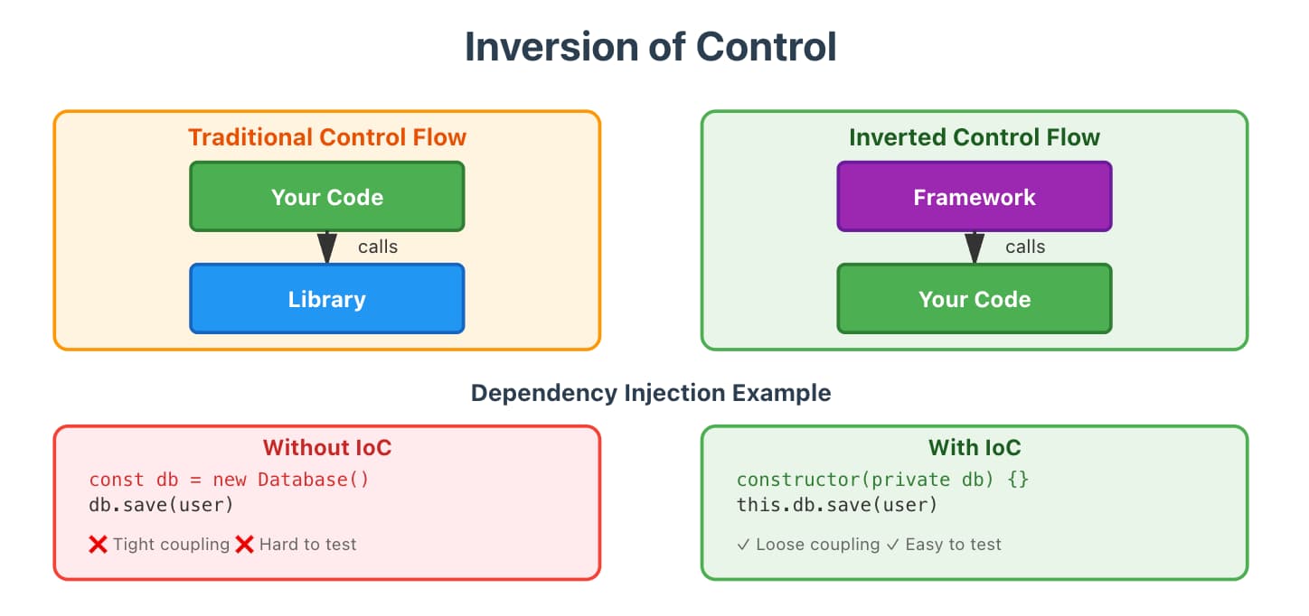 With IoC, the DataTable decides only when sorting should trigger, when filtering should trigger, when pagination should advance, and when rows should be rendered. But the user injects the behaviors: fetch logic, sorting logic, filtering logic, transformation logic, and cell rendering logic. The behavior is injected, and the lifecycle is controlled.